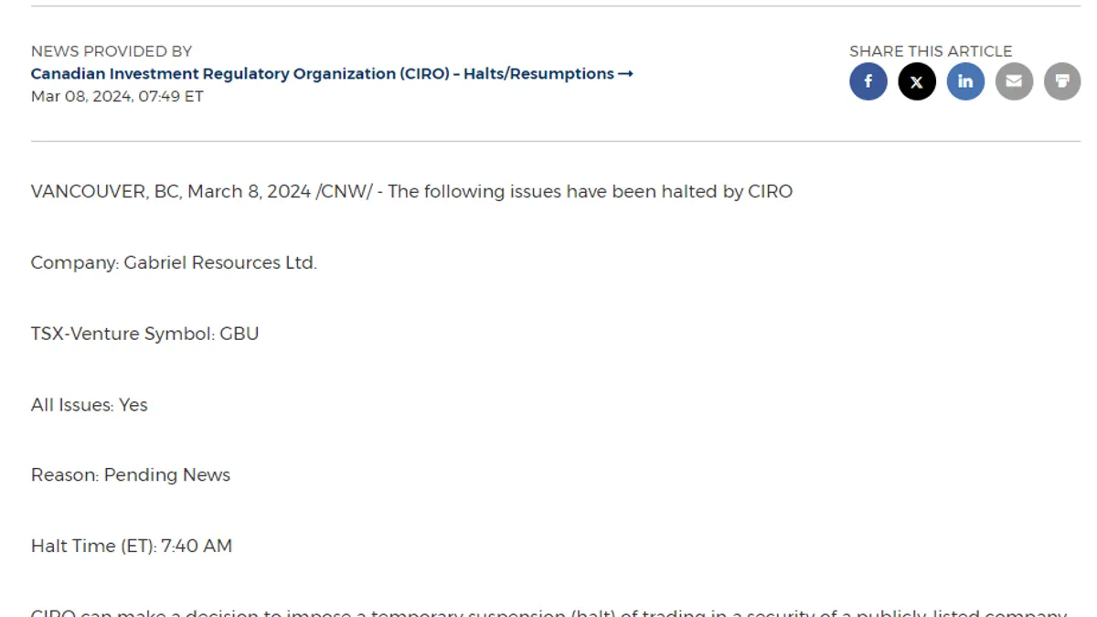 Organizația Canadiană de Reglementare a Investițiilor (CIRO) a decis cu câteva ore înainte de a fi făcută publică decizia în dosarul Roșia Montană să suspende de la tranzacționare acțiunile Gabriel Resource (GBU – indice bursier).
