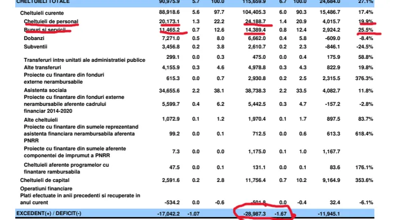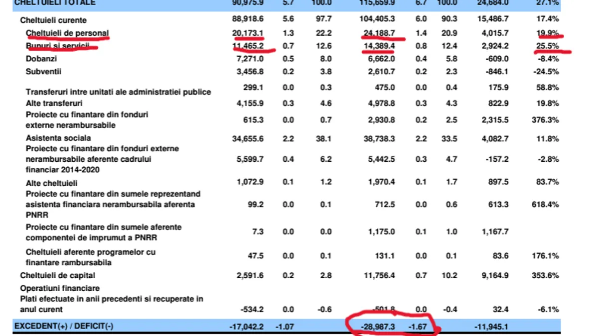 Premierul Ciolacu a susținut, acum câteva zile, că acest deficit se datorează cheltuielilor cu Apărarea, dar datele Finanțelor arată o explozie a cheltuielilor cu salariile bugetarilor. Aceste cheltuieli au crescut cu foarte puțin sub 20%, față de o planificare de 11%.