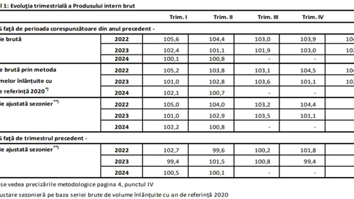 Produsul intern brut a înregistrat, în trimestrul II din 2024, o creștere de 0,8 % faţă de acelaşi trimestru din anul 2023, atât pe seria brută cât şi pe seria ajustată sezonier. Față de trimestrul I din 2024, creșterea a fost de doar 0,1%.
