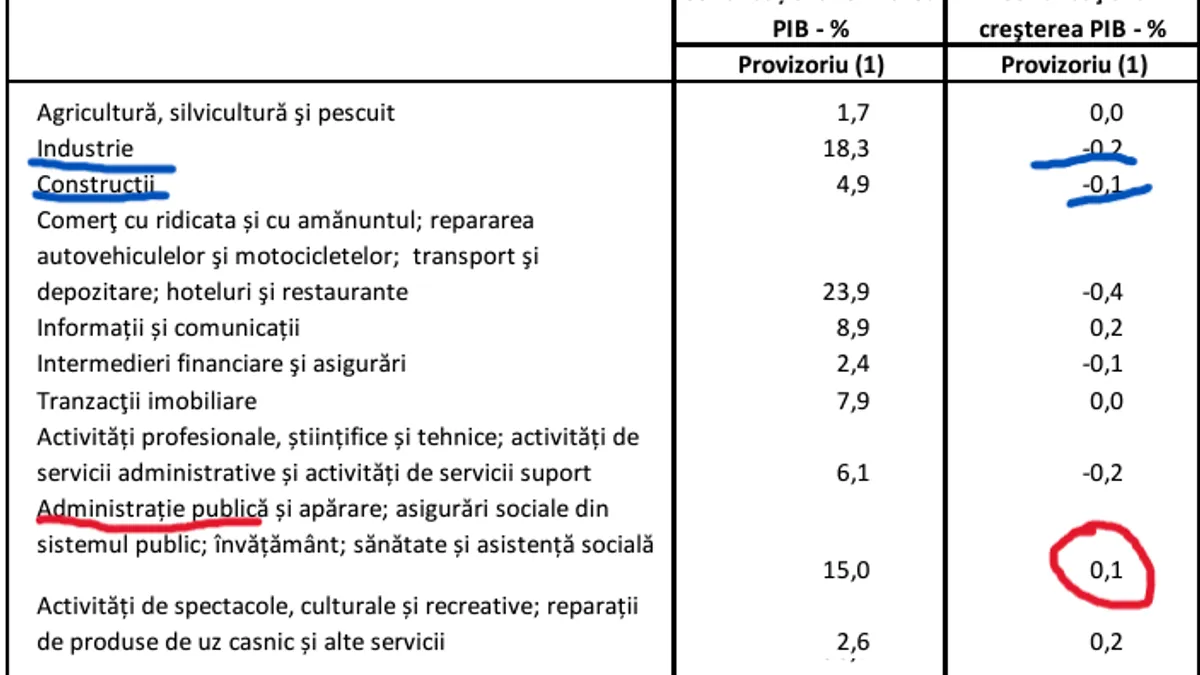 Însă PIB-ul nu a crescut ca urmare a majorării activităților din industrie sau construcții, ci din impozite, administrație publică și activități culturale.