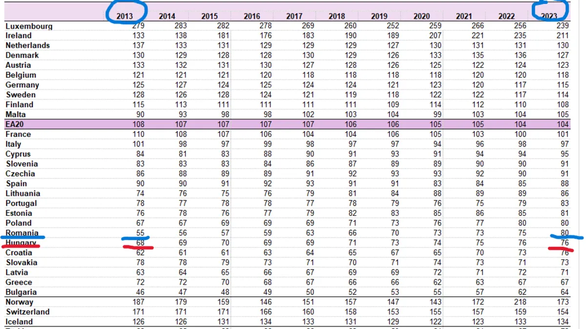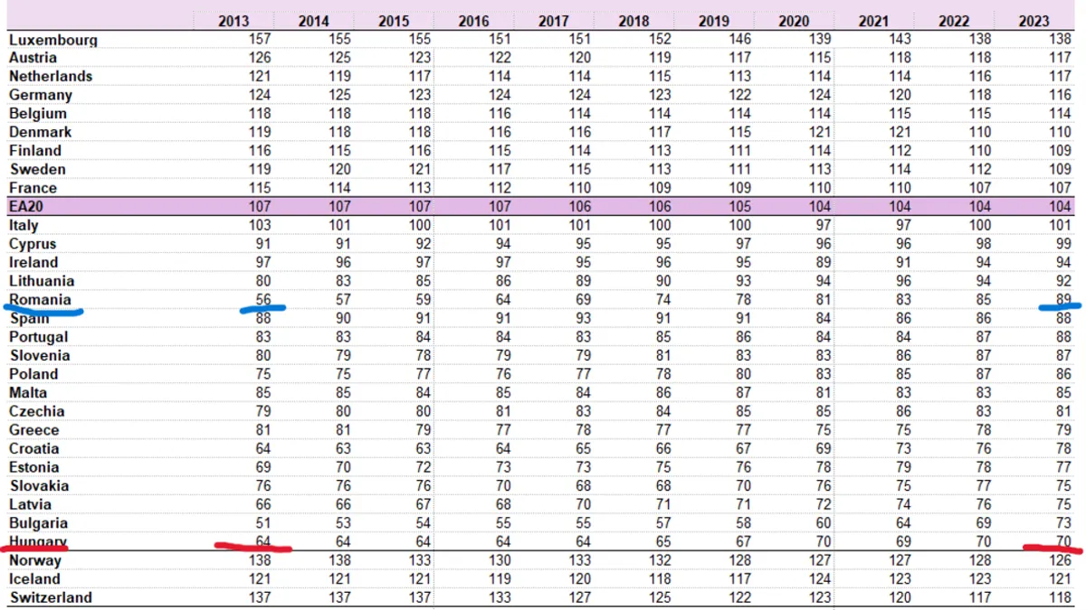 În 2013, România era la 56% din media UE. În 2023, ajunsese la 89%, peste Spania, Portugalia, Malta sau Grecia. În schimb, Ungaria, care în 2013 era la 64% din media UE - mult peste România - este acum pe ultimul loc în Uniune, fiind la 70% din medie.