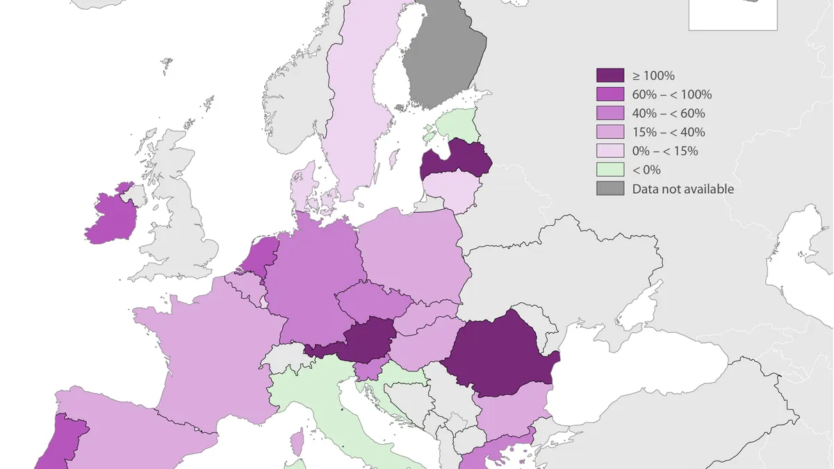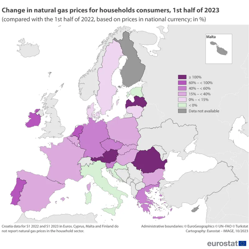 Între prima jumătate a anului 2022 și prima jumătate a anului 2023, prețul gazelor naturale a crescut în 20 din cele 24 de state membre ale UE care raportează prețurile gazelor naturale.