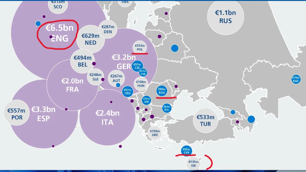 Raportul UEFA arată că veniturile fotbalului românesc au fost în 2023 de doar 90 de milioane de euro, sub Cipru și cu 50% sub Israel. Veniturile din fotbalul Angliei - 6,5 miliarde de euro, Germania - 3,2 miliarde de euro, Italia - 2,4 miliare de euro și Franța - două miliarde de euro.