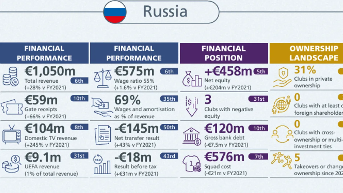 Până și în Rusia implicarea statului în acest sport este mai redusă: doar 50% din stadioane au statul drept proprietar, dar numai 31% din echipe sunt private. Însă fotbalul rusesc a produs venituri de 1,05 miliarde de euro.