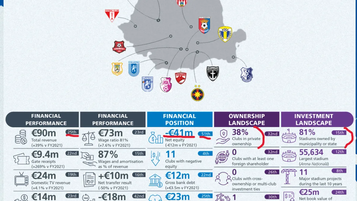În România, 81% din stadioane sunt deținute de stat și doar 32% din echipe sunt proprietate privată. Pentru comparație: în Irlanda, doar 40% din stadioane sunt de stat, iar 70% dine chipe au proprietari privați.