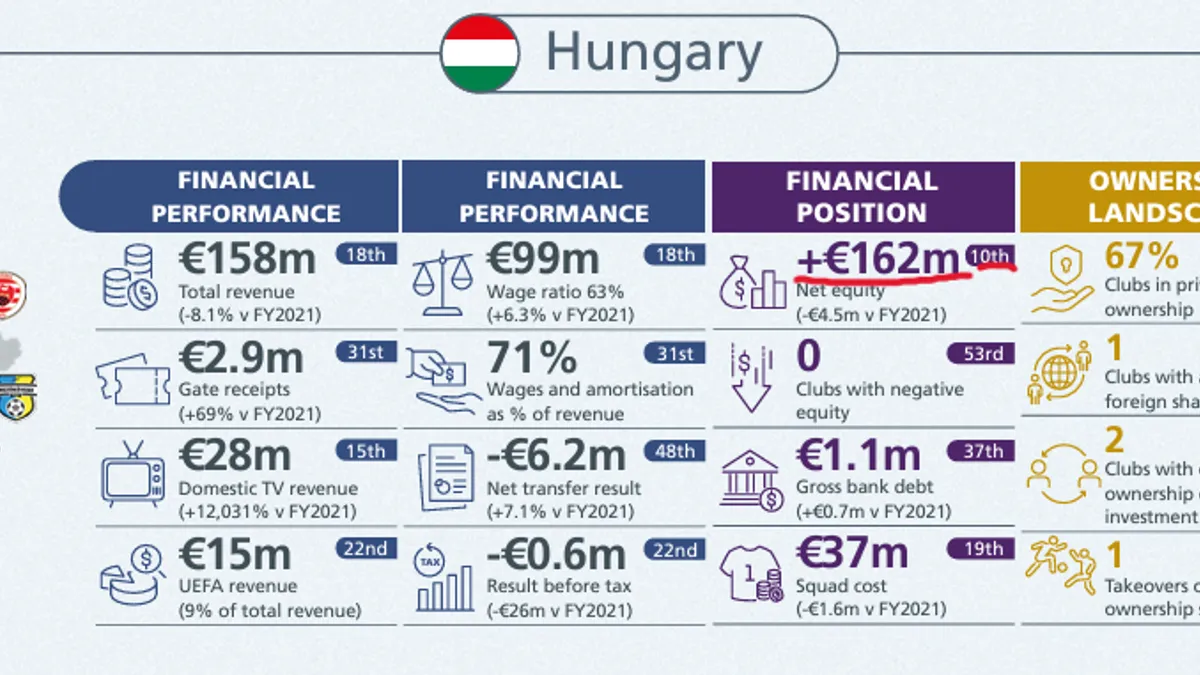 Îara vecină, Ungaria, are un procent uriaș de stadioane deținute de stat, peste 90%, dar peste 60% din echipe sunt private, iar una din ele are un investitor străin. Cu venituri de 158 de milioane de euro, fotbalul unguresc are rezultate financiare remarcabile.