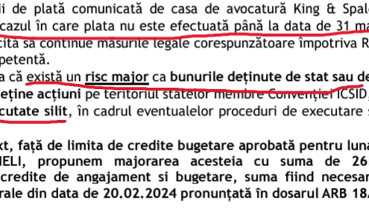 Atragem atenția că există un risc major ca bunurile deținute de stat sau de către societăți la care statul deține acțiuni pe teritoriul statelor membre Convenției ICSID, inclusiv România, să fie executate silit, în cadrul eventualelor proceduri de executare silită promovate de reclamanți”, se arată în memorandum.