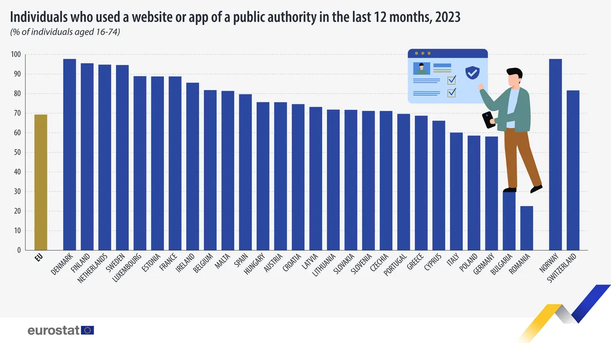 „În 2023, 69% dintre cetățenii UE cu vârste cuprinse între 16 și 74 de ani au utilizat un site web sau o aplicație a unei autorități publice în ultimele 12 luni.