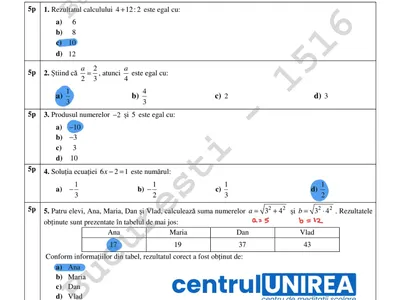 Subiectul I – Exerciții grilă cu logică matematică de bază