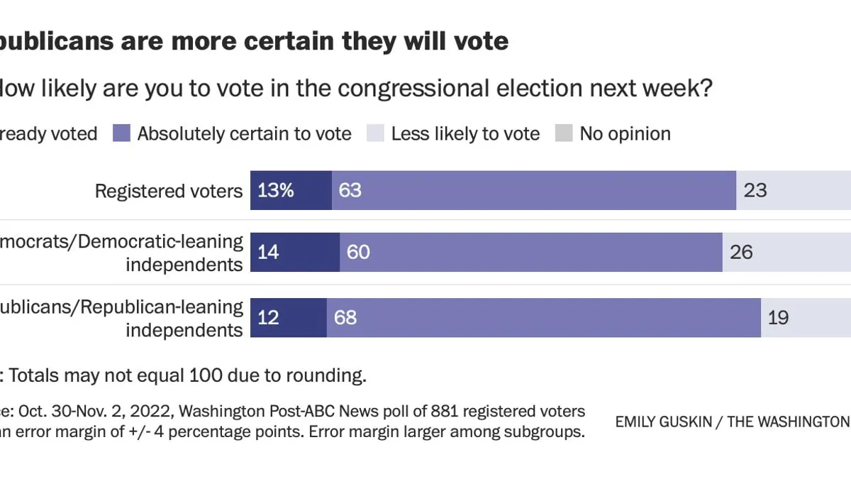 Problemele cheie ale alegătorilor sunt economia și inflația, unde republicanii dețin un avantaj clar, potrivit unui sondaj Washington Post-ABC News publicat în week-end. Doar 48% dintre cei chestionați consideră clima o problemă a acestor alegeri, mult sub cei peste 80% îngrijorați de economie. Acest sondaj arată însă că 32% dintre americani nu au încredere că voturile vor fi numărate corect.