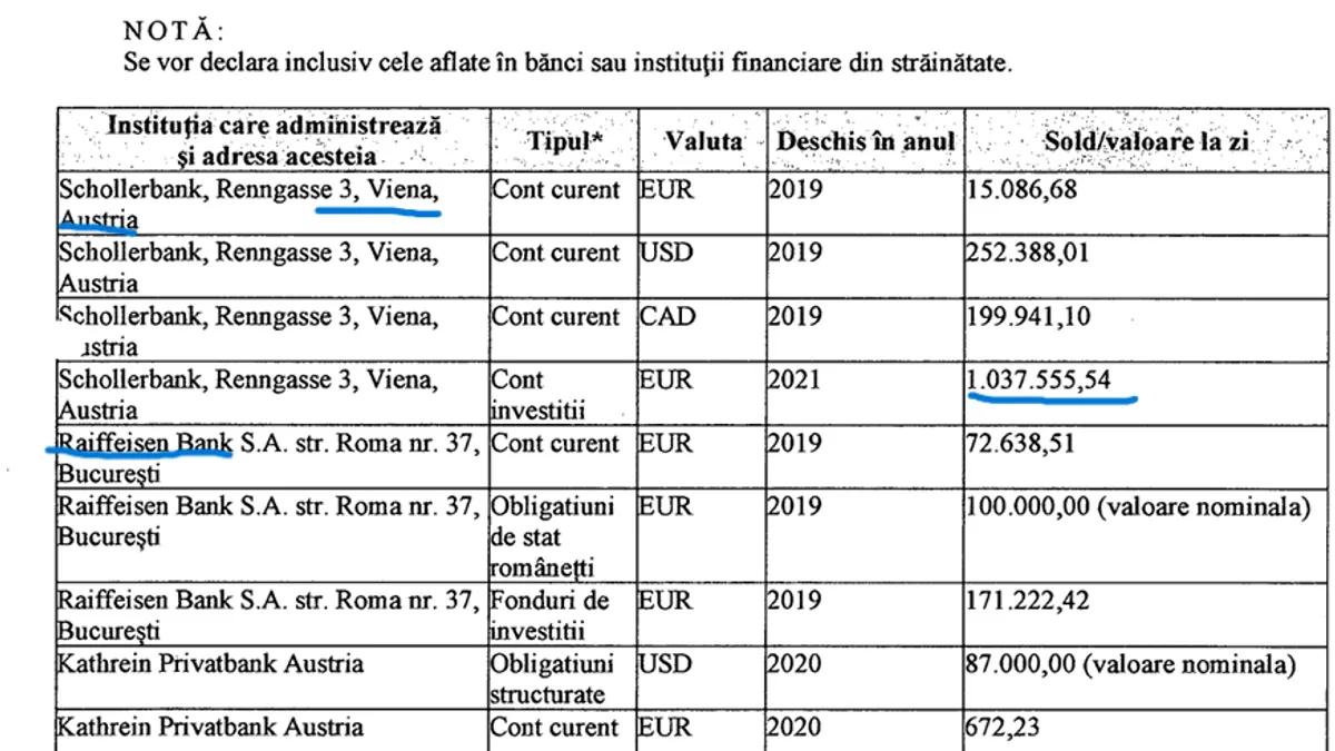 Viitorul europarlamentar își ține majoritatea banilor în bănci din Austria, unde are peste un milion de euro, 255.000 de dolari și 199.000 de dolari canadieni.