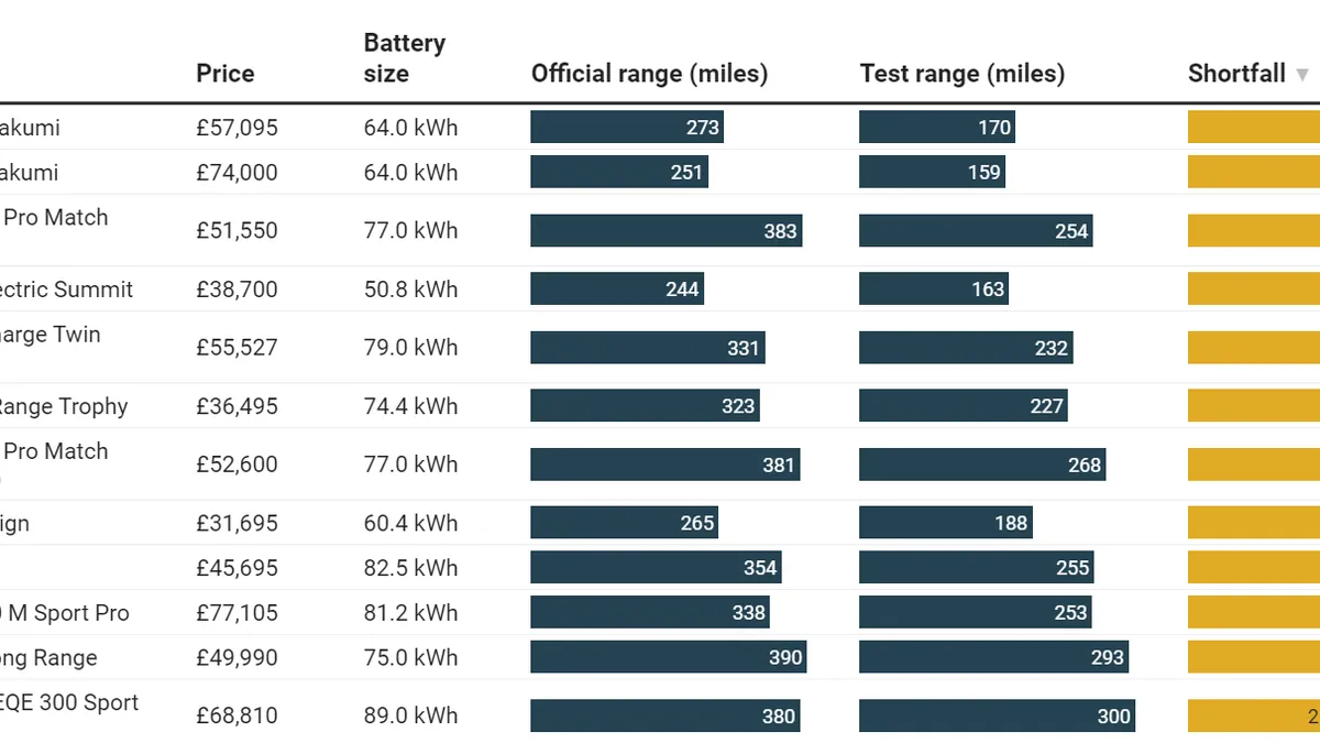 De exemplu, un Lexus UX 300e Takumi, de 57.000 de lire, a străbătut cu 37% mai puțin decât în prezentarea sa oficială.