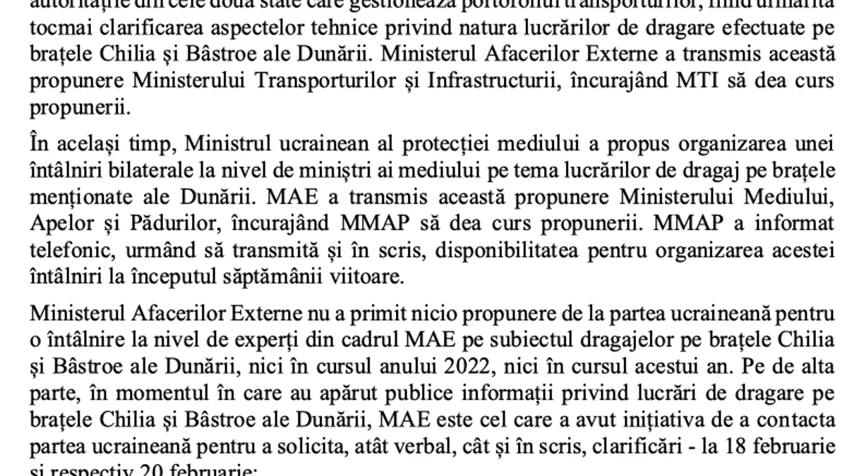 „Ministerul Afacerilor Externe a transmis această propunere Ministerului Transporturilor și Infrastructurii, încurajând MTI să dea curs propunerii. În același timp, Ministrul ucrainean al protecției mediului a propus organizarea unei întâlniri bilaterale la nivel de miniștri ai mediului pe tema lucrărilor de dragaj pe brațele menționate ale Dunării. MAE a transmis această propunere Ministerului Mediului, Apelor și Pădurilor, încurajând MMAP să dea curs propunerii. MMAP a informat telefonic, urmând să transmită și în scris, disponibilitatea pentru organizarea acestei întâlniri la începutul săptămânii viitoare. Ministerul Afacerilor Externe nu a primit nicio propunere de la partea ucraineană pentru o întâlnire la nivel de experți din cadrul MAE pe subiectul dragajelor pe brațele Chilia și Bâstroe ale Dunării, nici în cursul anului 2022, nici în cursul acestui an”, a transmis Ministerul Afacerilor Externe.
