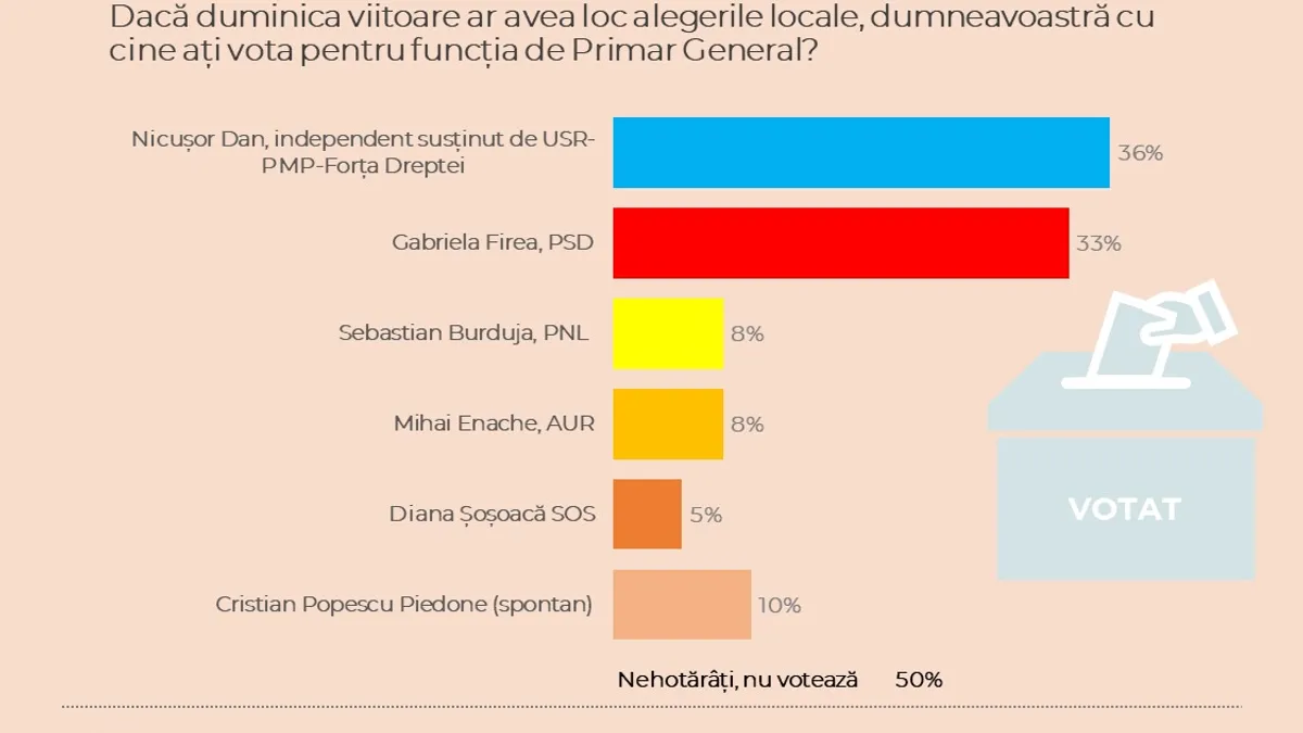 Un sondaj efectuat de un institut apropiat PSD, CURS, arată că Nicușor Dan câștigă alegerile în București, cu un scor de 36%. Principala sa contracandidată rămâne Gabriela Firea (PSD), dar aceasta ar obține un scor de doar 33%. Recent, soțul lui Firea, Florentin Pandele, a declarat că aceasta nu va candida la primăria Capitalei.