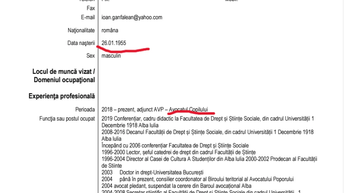 CV-ul lui Gânfălean nu arată care ar fi legătura acestuia cu drepturile copilului: el a fost jurist la uniunea județeană a CAP-urilor din Olt și din Alba, a condus Casa de Cultură a Studenților din Alba Iulia și a fost conferențiar universitar la o universitate din Alba Iulia.