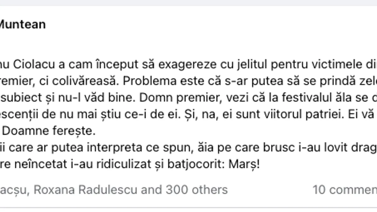 Domn premier, vezi că la festivalul ăla se dr@ghează tinerii și adolescenții de nu mai știu ce-i de ei. Și, na, ei sunt viitorul patriei. Ei vă vor îngriji la azil, în caz că Doamne ferește.