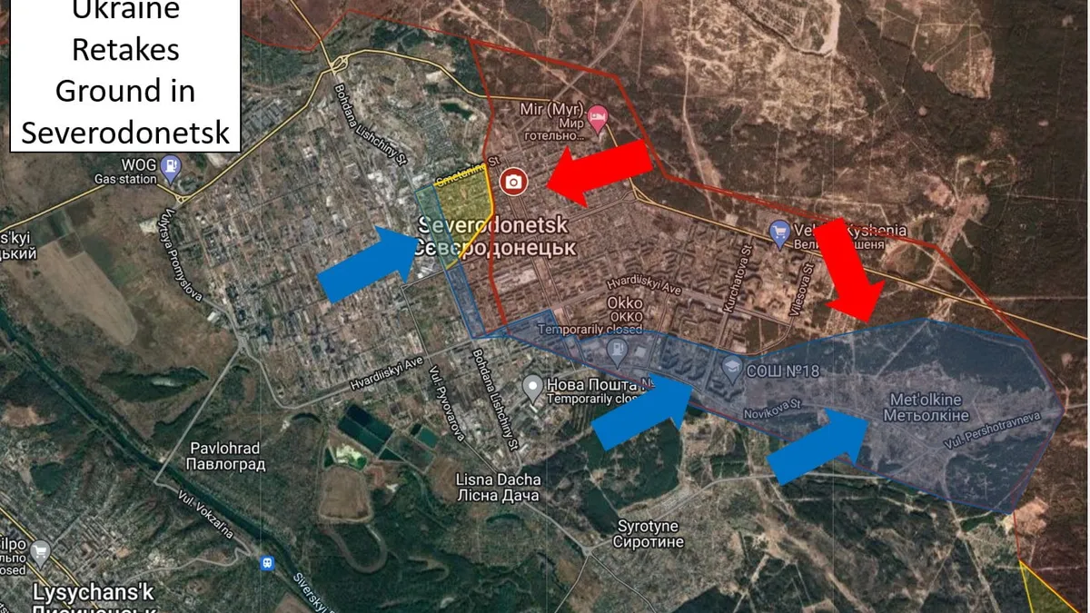 „După o săptămână de lupte urbane sângeroase, bloc cu bloc, luptătorii ucraineni au recuperat părți din Severodonetsk, potrivit lui Serghei Haidai, guvernatorul regiunii Lugansk.