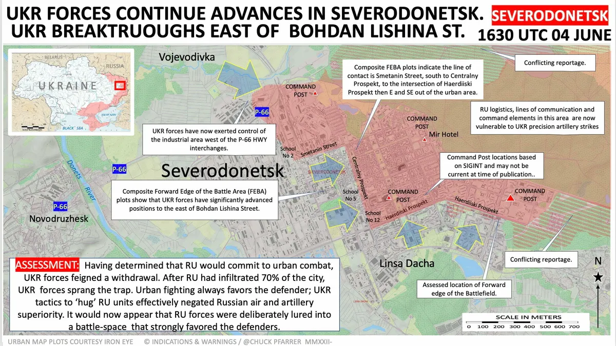 (1/4) Over the last 24 hours, Ukrainian forces have counterattacked in the contested city of Sieverodonetsk in eastern Ukraine, likely blunting the operational momentum Russian forces previously gained through concentrating combat units and firepower.