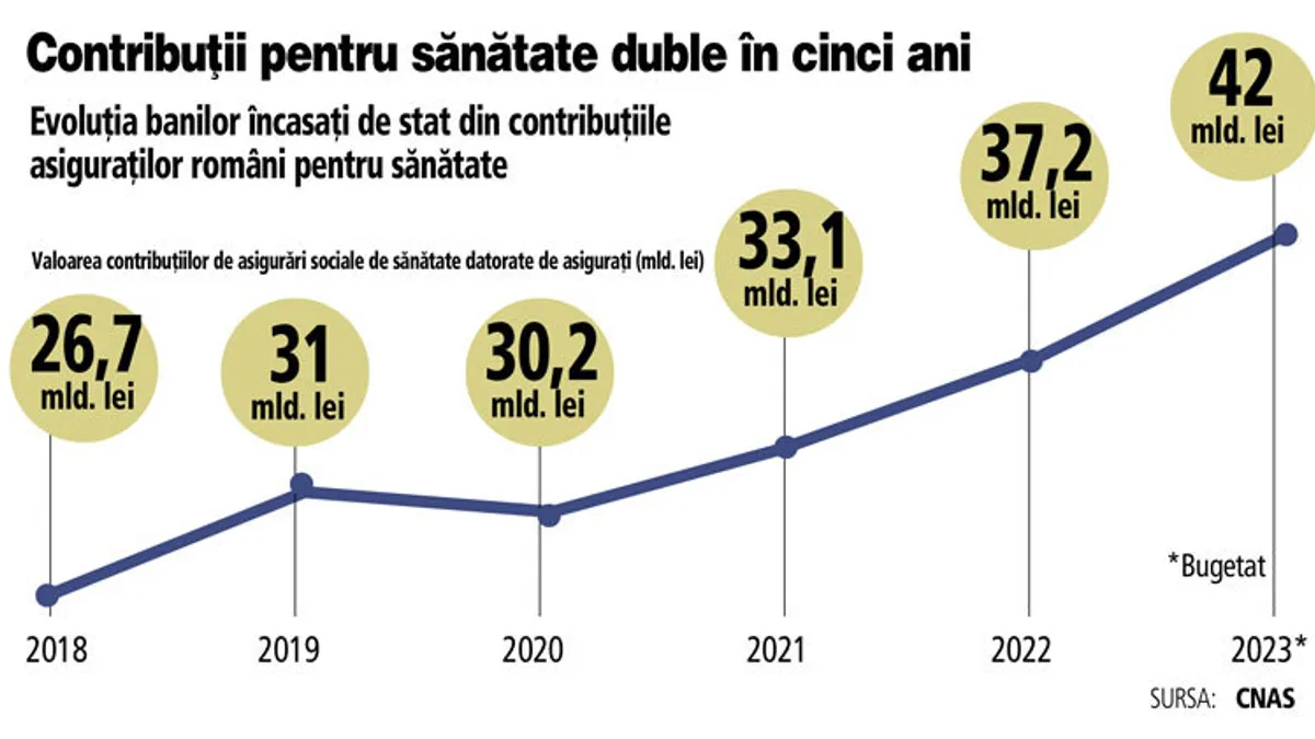 Datele publice arată că, în 2018, valoarea contribuțiilor obligatorii la sănătatea de stat era de 26,7 miliarde de lei. În 2019 - 31 de miliarde de lei. În 2021 - 33,1 miliarde de lei, 2022 - 37,2 miliarde. În 2023, asigurații vor asigura venituri ale CNAS de 43 de miliarde, diferența până la 54 de miliarde fiind asigurată din diferite alte surse, inclusiv subvenții de 5,1 miliarde de lei.