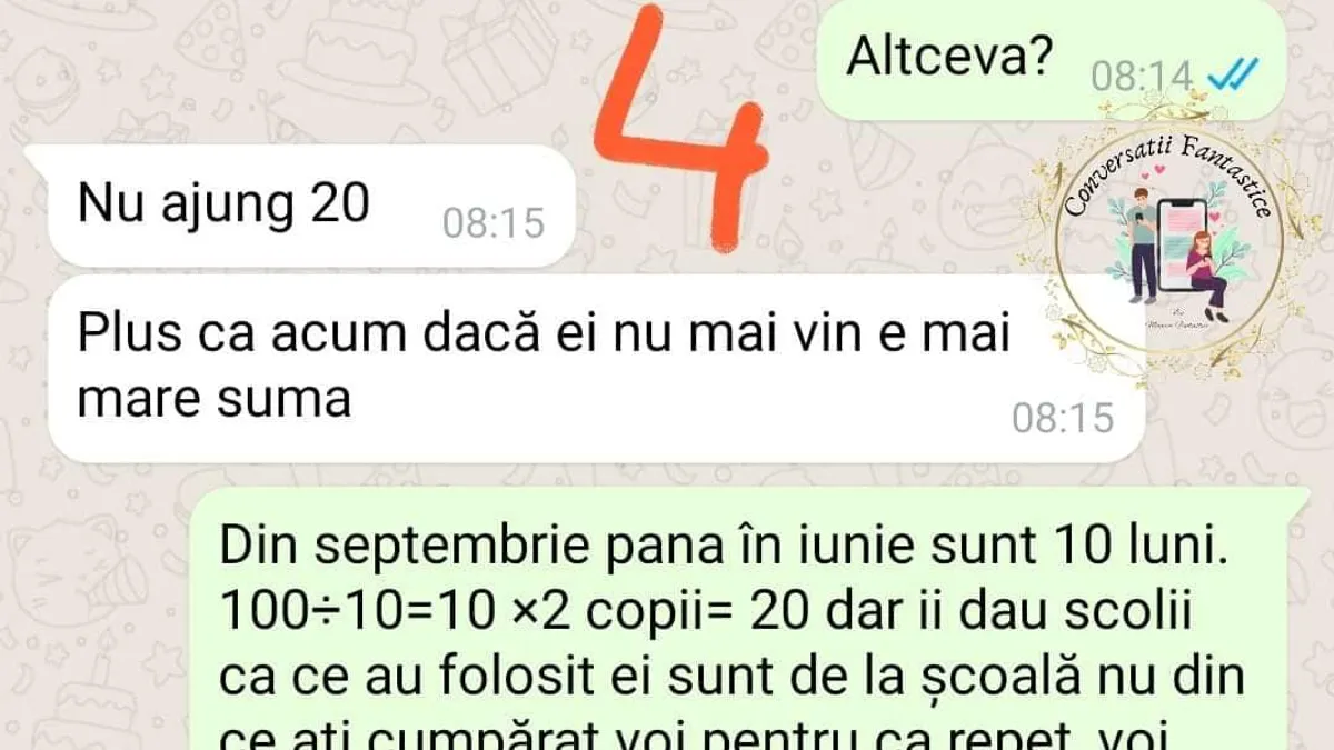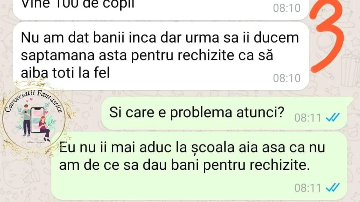 „Ce se întâmplă ma cu mamele??? Uitați si voi o conversatie «normala» cu o mamă care are reclamații ca îmi transfer copiii într-o altă școală”, se arată în postarea „Conversații fantastice”.