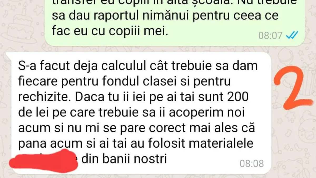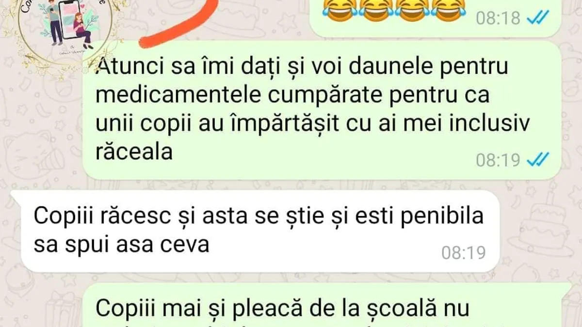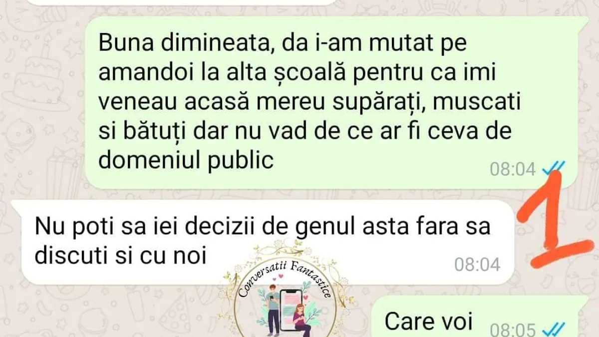 Conversație halucinantă pe un grup de whatsapp al mămicilor: o mamă este certată findcă și-a mutat copiii la o altă școală, arătând că aceștia veneau acasă mușcați și bătuți. „O sa fac plângere la directoare să vedem atunci cât de tare în clanță o să mai fi” (sic!), o amenință o altă mamă de la școala de unde copiii fuseseră mutați.