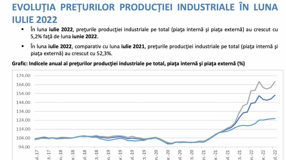 „În luna iulie 2022, preţurile producţiei industriale pe total (piaţa internă şi piaţa externă) au crescut cu 5,2% faţă de luna iunie 2022.