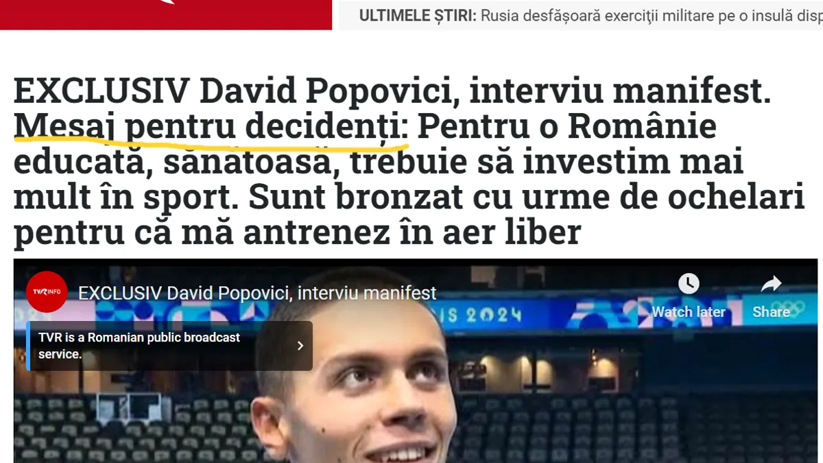 Criticile lui David Popovici către politicieni, inexistente pe site-ul TVR 1. TVR Info a realizat interviul, dar titlul este „mesaj pentru decidenți”