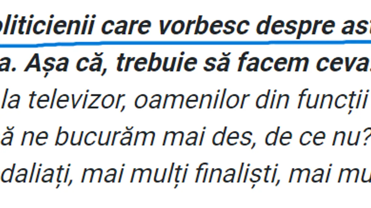 Ăsta este un mesaj către toți politicienii care vorbesc despre asta, dar la un moment dat mesajul se blochează pe undeva. Așa că, trebuie să facem ceva! Pentru că vedeți toate reacțiile oamenilor obișnuiți care se uită la televizor, oamenilor din funcții înalte… toată lumea e fericită, toată lumea se bucură, dar hai să ne bucurăm mai des, de ce nu? Hai să avem mai mulți campioni olimpici, mai mulți medaliați, mai mulți finaliști, mai mulți calificați la Jocurile Olimpice”.
