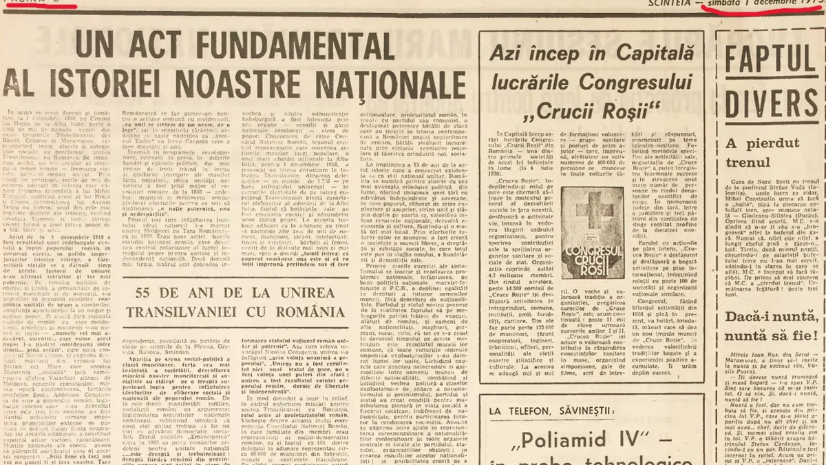 Cum a marcat regimul Ceaușescu ziua de 1 Decembrie, acum 50 de ani: Unirea, pe pagina șase din Scânteia. Pe prima, Ceaușescu făcea apologia investițiilor străine, a relațiilor cu SUA