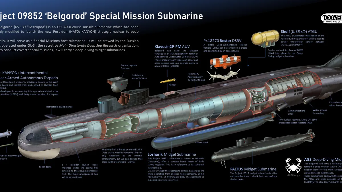 Sutton exclude și folosirea submarinului nuclear pentru misiuni speciale, Belgorod, care s-ar afla în Marea Arctică. El arată că Rusia are drone subacvatice, dar acestea ar fi avut nevoie de o navă-mamă, de pe care să plece.