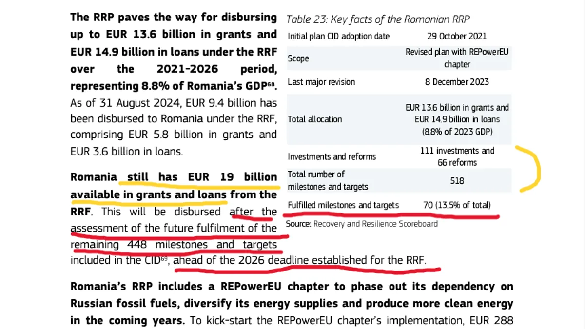 „România mai dispune de 19 miliarde EUR în granturi și împrumuturi din PNRR. Această sumă va fi plătită după evaluarea îndeplinirii viitoare a celor 448 de etape și obiective rămase, înainte de termenul limită de 2026 stabilit pentru RRF”, arată oficialii de la Bruxelles.