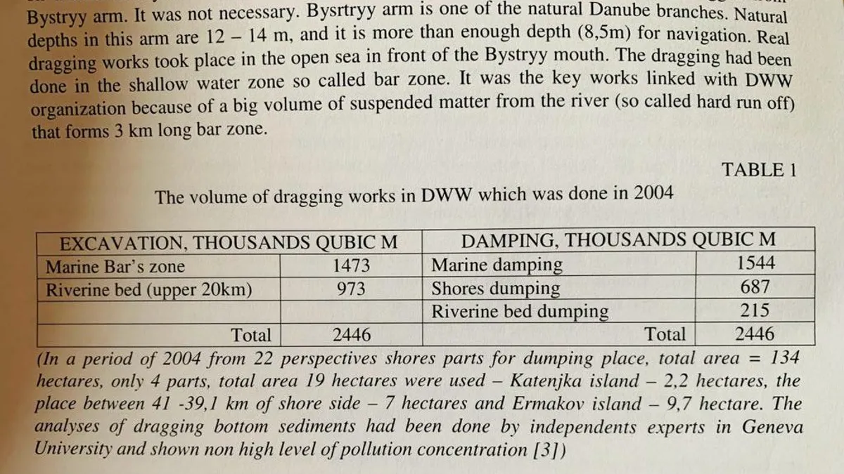 Dragarea a fost făcută în zona de apă de mică adâncime (…). Acestea au fost lucrările cheie legate de canalul navigabil, datorită unui volum mare de materii în suspensie din râu (așa-numita scurgere dură) care formează o zonă de baraj cu o lungime de 3 km”, arată un studiu făcut pentru OSCE de către Nikolai Berlinski, de la Institutul de biologie a mărilor sudice din Odesa, o filială a Academiei Ucrainei.