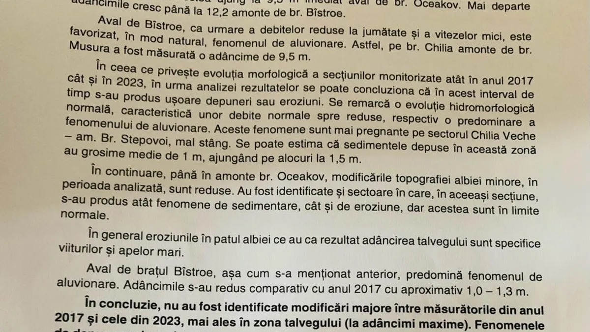 Potrivit unui document consultat de DeFapt.ro, din măsurătorile făcute la 22 februarie de Apele Române reieșea că „repartiția debitelor pe brațul Chilia (aval de Periprava) și brațele secundare Oceakov și Bâstroe poate fi încadrată ca o situație normală”.