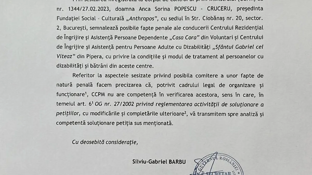 „Prin sesizarea înregistrată la Corpul de control al prim-ministrului (CCPM) cu nr. 1344/ 27.02.2023, doamna Anca Sorina Popescu – Cruceru, președinta Fundației Social - Culturală «Anthropos», (…) semnalează posibile fapte penale ale conducerii Centrului Rezidențial de Îngrijire și Asistență Persoane Dependente «Casa Cora» din Voluntari și Centrului de Îngrijire și Asistență pentru Persoane Adulte cu Dizabilități «Sfântul Gabriel cel Viteaz» din Pipera, cu privire la condițiile și modul de tratament al persoanelor cu dizabilități și bătrâni din aceste centre”, arată documentul trimis de șeful Corpului de control al prim-ministrului, secretarul de stat Silviu - Gabriel Barbu către președinta Parchetului de pe lângă Judecătoria Buftea, Elisabeta Mihaela Iordăchescu.