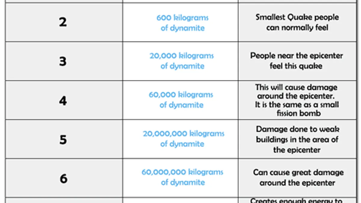 Pe scara Richer, intensitatea cutremurelor nu crește liniar, ci logaritmic. Cutremurele cu intensitate între cinci și șase sunt considerate „mici-moderate” și, teoretic, pot produce doar avarii minore la clădiri cu probleme. Anual se înregistrează între 200 și 2000 de cutremure cu intensitate între 5 și 6 pe scara Richter.