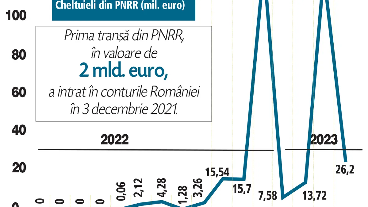 Însă datele ministerului de Finanțe arată chiar mai rău. La final de aprilie 2023, potrivit excecuției bugetare, în acest an se cheltuiseră 477 milioane lei - adică sub 100 de milioane de euro - din fondurile PNRR nerambursabile (deci fără partea de granturi). În 2022, la 31 decembrie, sumele cheltuite erau de 235 milioane lei. În total: circa 712 milioane lei cheltuiți din PNRR, partea de granturi.