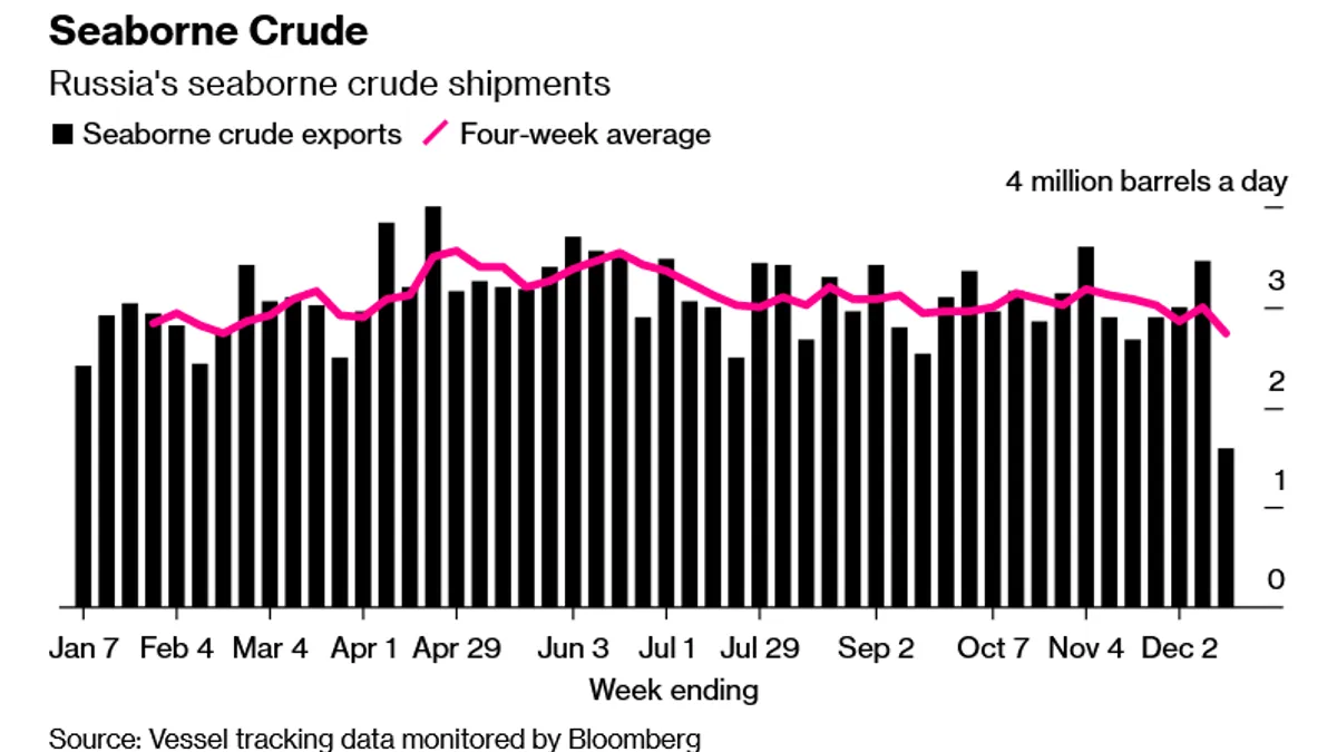 Exporturile rusești de petrol s-au prăbușit cu peste 50% după declanșarea embargoului UE, arată datele colectate de agenția Bloomberg. Pe de altă parte, Kommersant scrie de o scădere de 11%, între 1 și 20 decembrie, citând surse rusești.