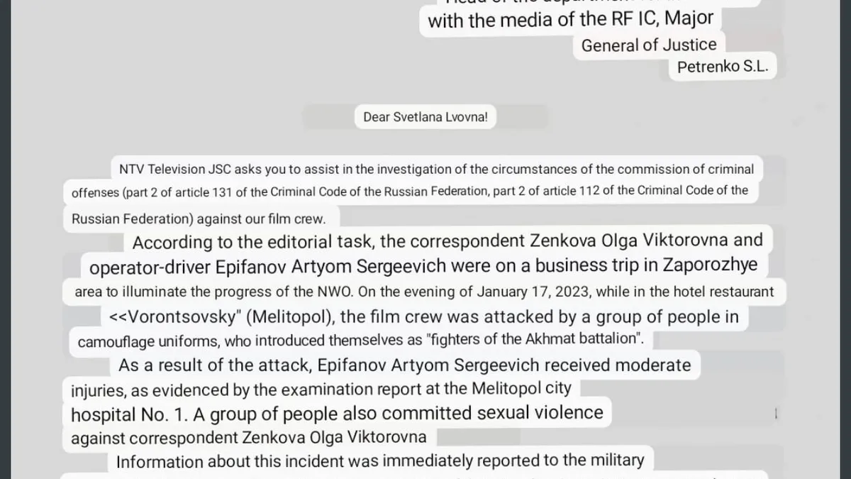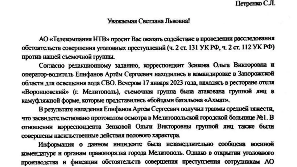 În ceea ce privește reporterul Olga Viktorovna Zenkova, grupul de persoane a comis și acte violente de natură sexuală», se arată în apelul conducerii NTV către comitetul de investigații.