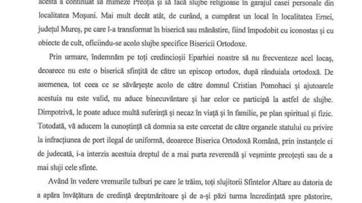 "Cu multă îngrijorare și durere, vă aducem la cunoștință faptul că domnul Cristian Pomohaci, fost paroh al Parohiei Moșuni, Protopopiatul Târgu Mureș, deși nu mai are calitatea de preot, a continuare să mimeze Preoția și să facă slujbe religioase în garajul casei personale din localitatea Moșuni. Mai mult decât atât, de curând, a cumpărat un local în localitatea Ernei, județul Mureș, pe care l-a transformat în biserică sau mănăstire, fiind împodobit cu iconostas și cu obiecte de cult, oficiindu-se acolo slujbe specifice Bisericii ortodoxe.