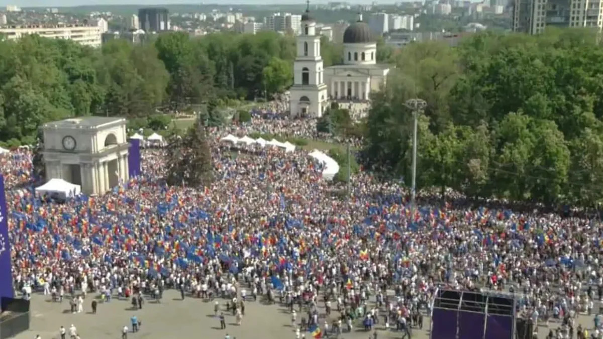 Un miting uriaș, cu zeci de mii de participanți, se desfășoară la Chișinău, în sprijinul integrării Republicii Moldova în Uniunea Europeană. La miting a vorbit, în română, președintele Maia Sandu, dar ea a adresat mesaje și în usă, ucraineană, găgăuză și bulgară.