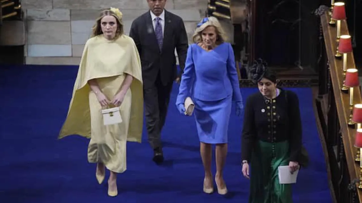 Dr. Jill Biden, prima doamnă a SUA, care participă la încoronare în locul președintelui Biden, a purtat o jachetă, o fustă și mănuși albastre. Ea a fost însoțită de nepoata Finnegan Biden, al doilea copil în vârstă de 22 de ani al lui Hunter Biden și al fostei sale soții Kathleen Buhle, purtând o rochie galbenă cu o pelerină și o bentiță galbenă pe cap”, arată The Telegraph.