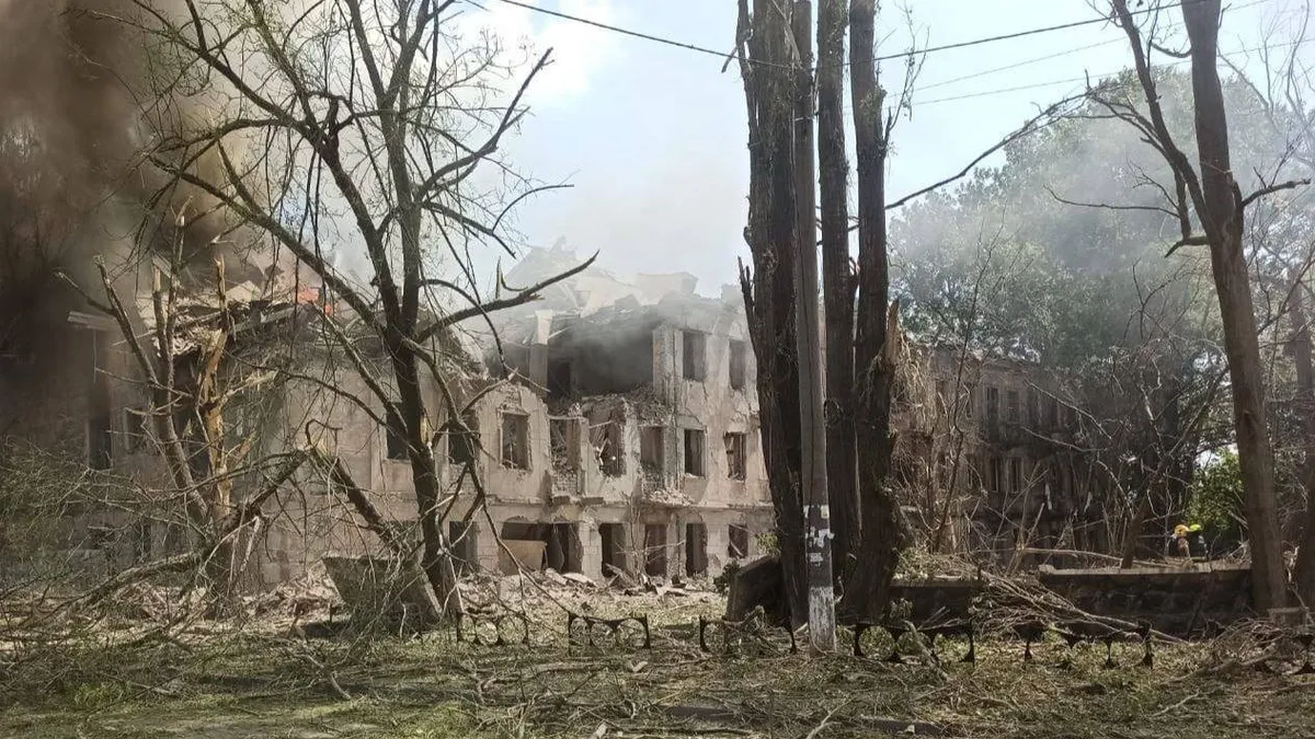 Zelenski a postat un videoclip al clădirii grav avariate, în care se văd pompieri la fața locului și fumul care învăluie ruinele.