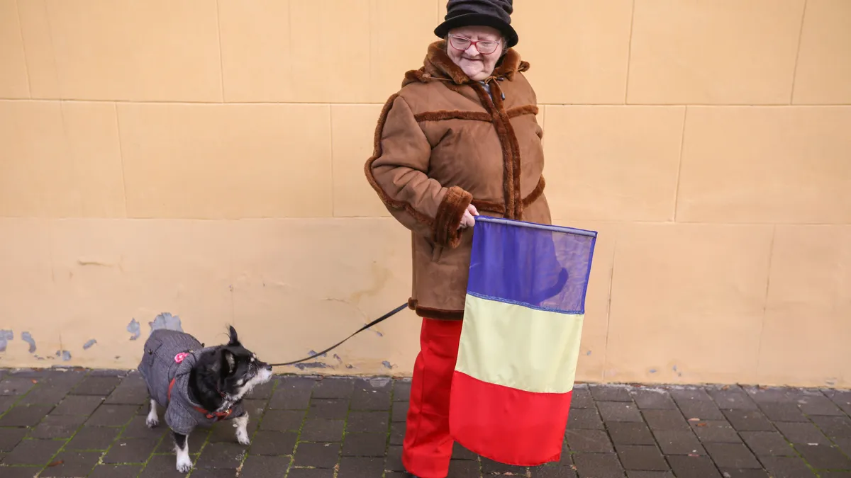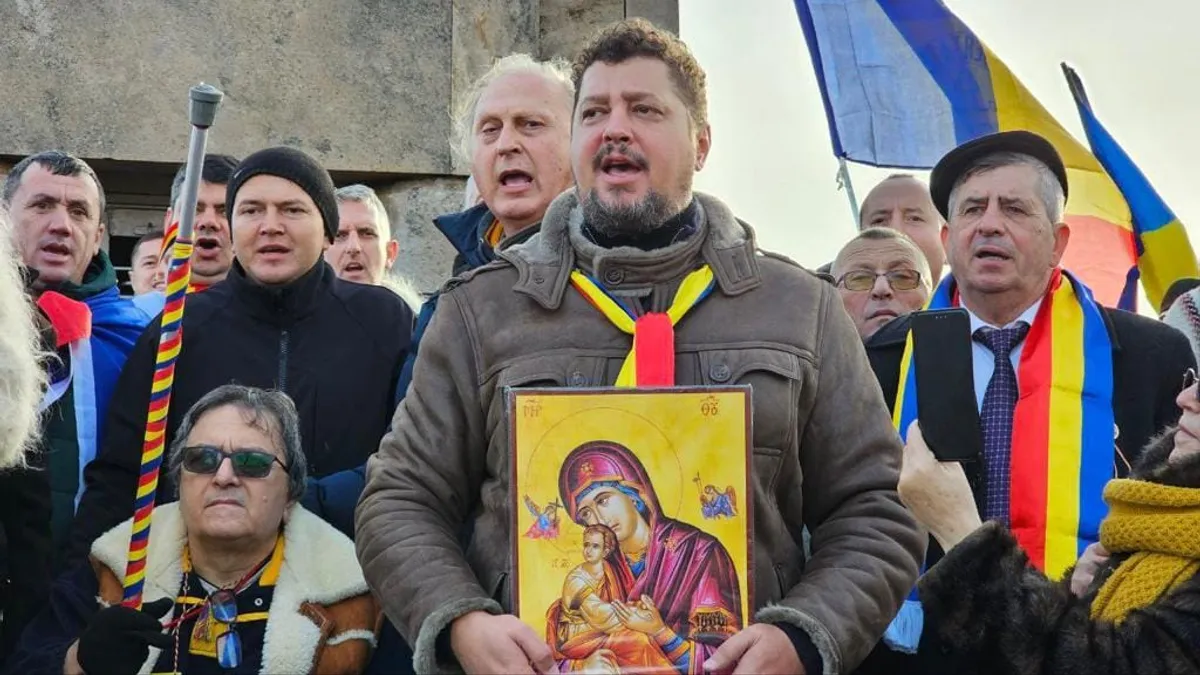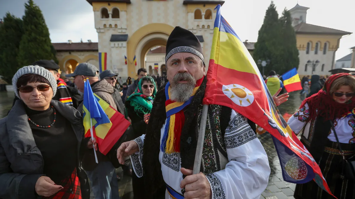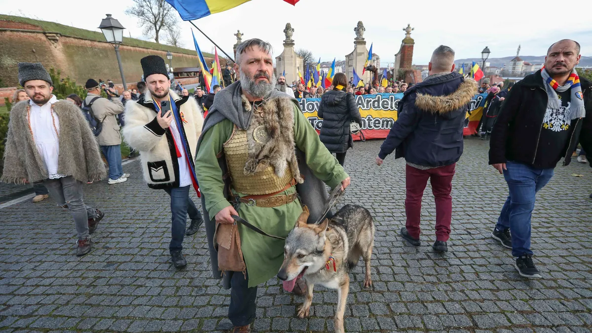 AUR la Alba Iulia: fotografiile realizate agenția Inquam sau de pe rețele sociale arată o mulțime de pensionari, dintre care unii cu câini, daci cu zale și blană de vulpe și vrânceanul George Simion cu bundă de maramureșean, în fruntea tuturor.