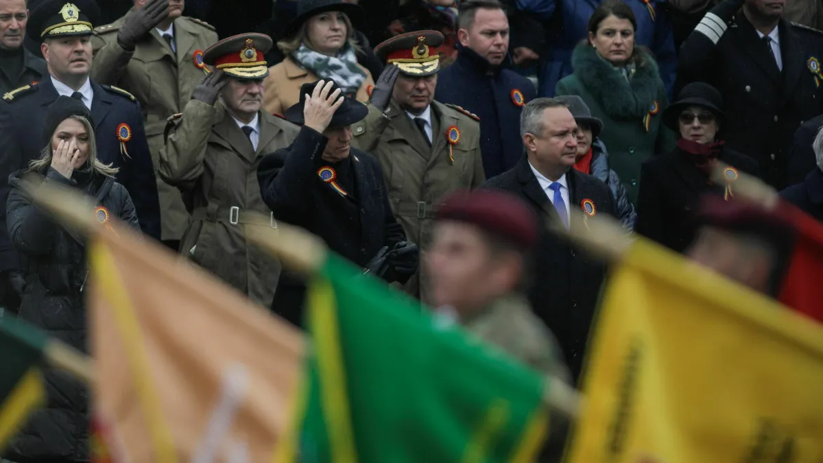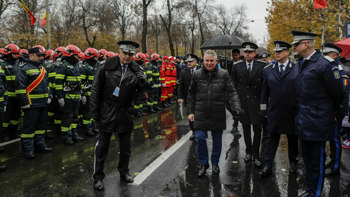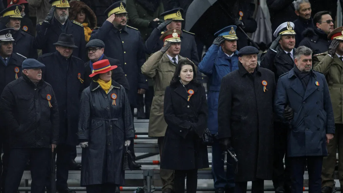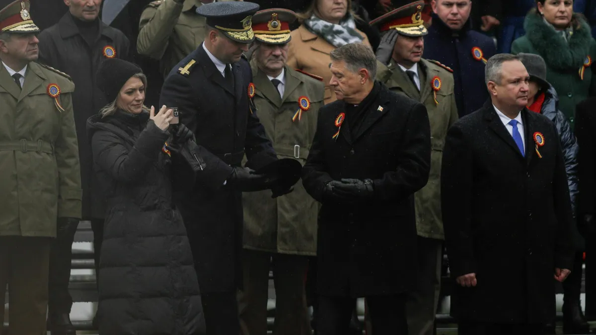 Parada de 1 decembrie, ce nu s-a văzut la TV: Ciolacu a stat la braț cu președintele CCR, Marian Enache, fost deputat PSD, președintele Iohannis primește de la aghiotantul său o pălărie, care să-l apere de ploaie, iar ministrul de Interne, Lucian Bode, este surprins zgribulit de frig, printre militari.