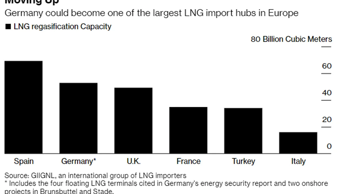 Terminalele plutitoare - plusalte două care vor fi construite pe uscat - ar plasa Germania înaintea Marii Britanii în ceea ce privește capacitatea de import degaze lichefiate, fiind doar în urma Spaniei, în UE. Mai multe terminale on-shore sunt în fazele incipiente de planificare. Toate contribuie la obiectivul Germaniei de a reduce ponderea gazului rusesc pe care îl importă la 10% până la jumătatea anului 2024, de la 35% în prezent și mai mult de 50% înainte de invazie”, scrie Bloomberg.