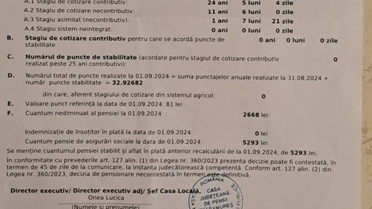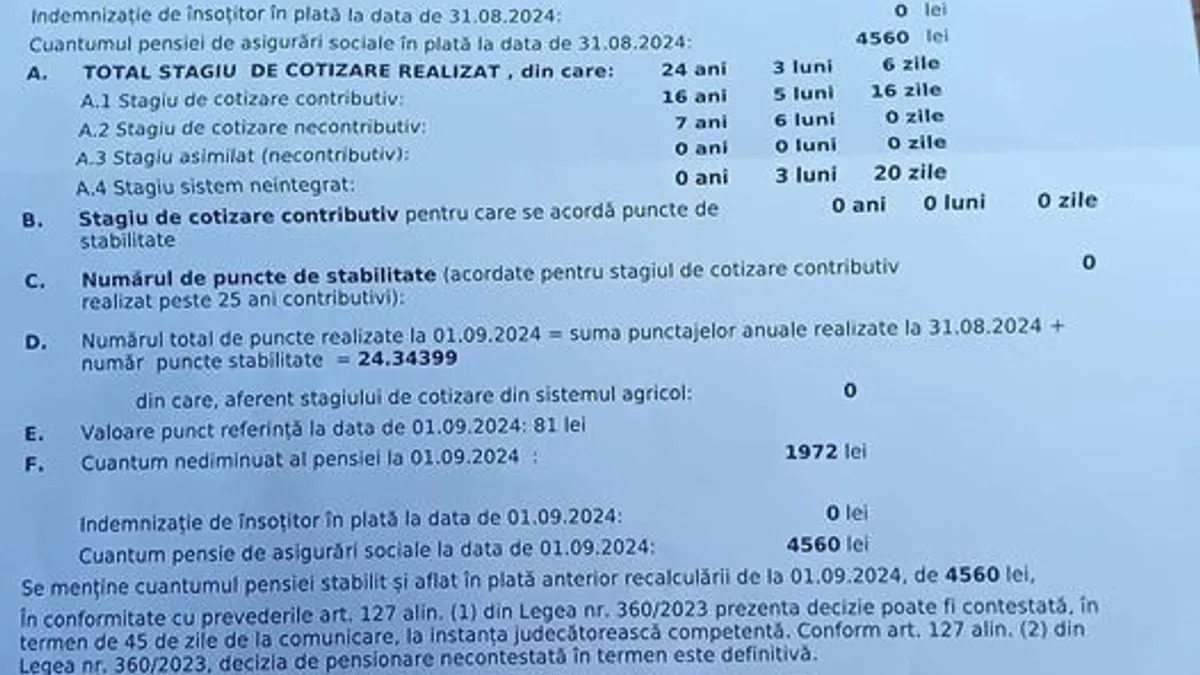Potrivit unui document de recalculare a pensiei, postat pe un grup de Facebook, un pensionar care a cotizat „contributiv” timp de 24 de ani, cinci luni și patru zile, avea o pensie de 5.293 de lei, dar ar merita - potrivit noii legi - doar 2.668 de lei.