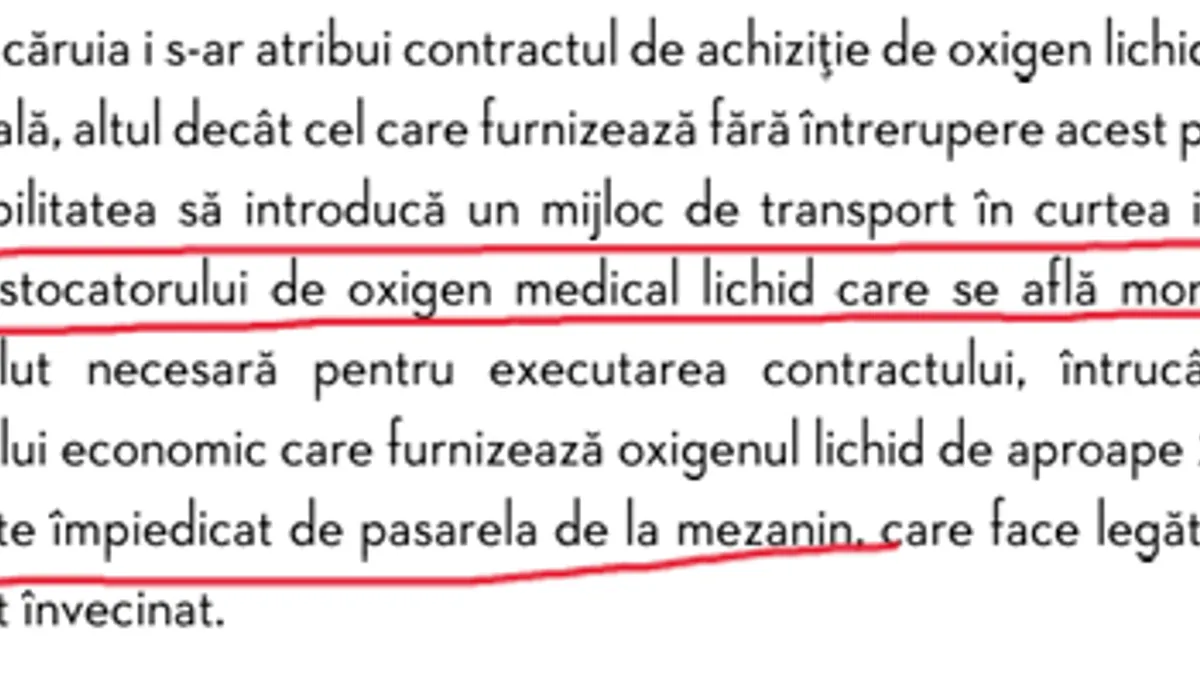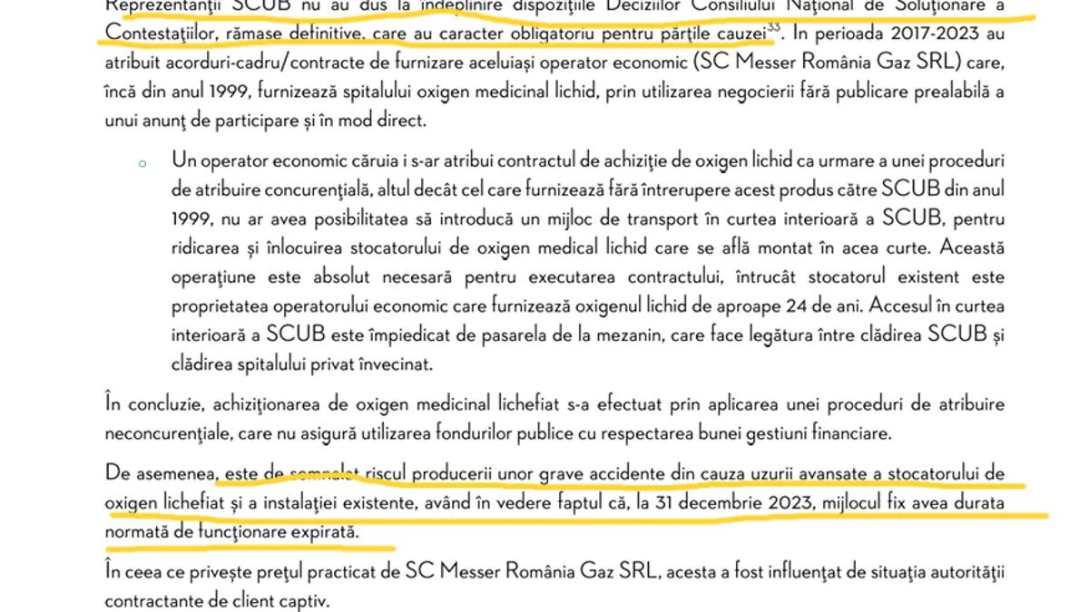 Curtea de Conturi arată că, între 1999 și 2023, Spitalului de Clinic de Urgență București - spitalul Floreasca - a cumpărat oxigen lichid de la aceeași companie, Messer România Gaz SRL, prin achiziție directă și ignorând o decizie a Consiliului Național pentru Soluționarea Contestațiilor. Doar această firmă poate să ajungă la tancul de depozitare, accesul mașinilor fiind limitat de o pasarelă care leagă acest spital de stat de o clinică privată.