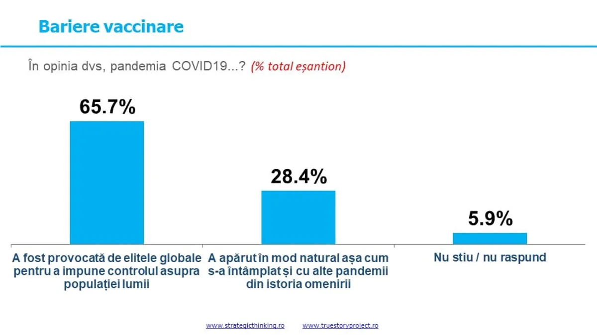 Peste 65% dintre români cred că pandemia a fost provocată de „elitele globale pentru a impune controlul asupra populației lumii”, arată un sondaj INSCOP. Sub o treime (28.4%) crede că pandemia de Covid19 a apărut în mod natural așa cum s-a întâmplat și cu alte pandemii din istoria omenirii.