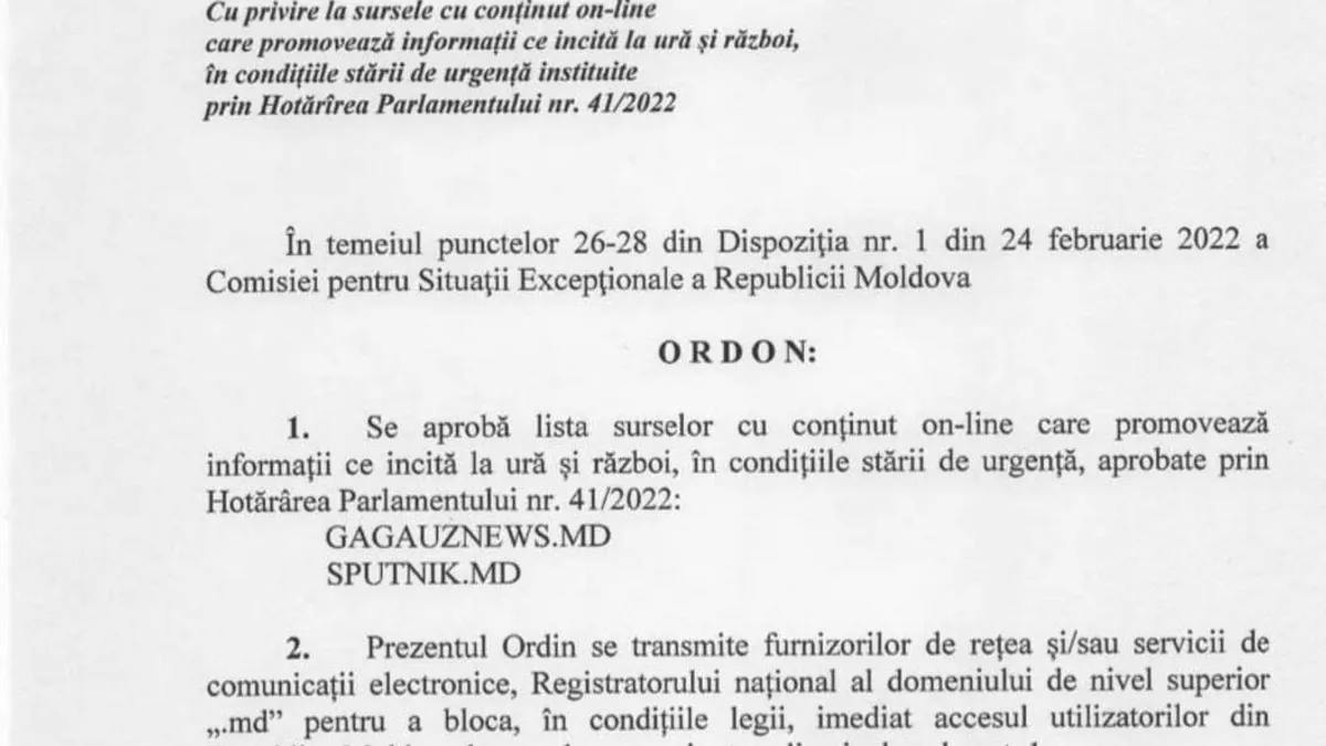 „Directorul Serviciului de Informaţii şi Securitate a emis, sâmbătă, un ordin ce prevede blocarea a două surse cu conținut online, promotoare de informații ce incită la ură și război, în condițiile stării de urgență. Astfel, urmează a fi sistate portalurile www.sputnik.md și www.gagauznews.md”, a anunțat instituția, într-un comunicat de presă.