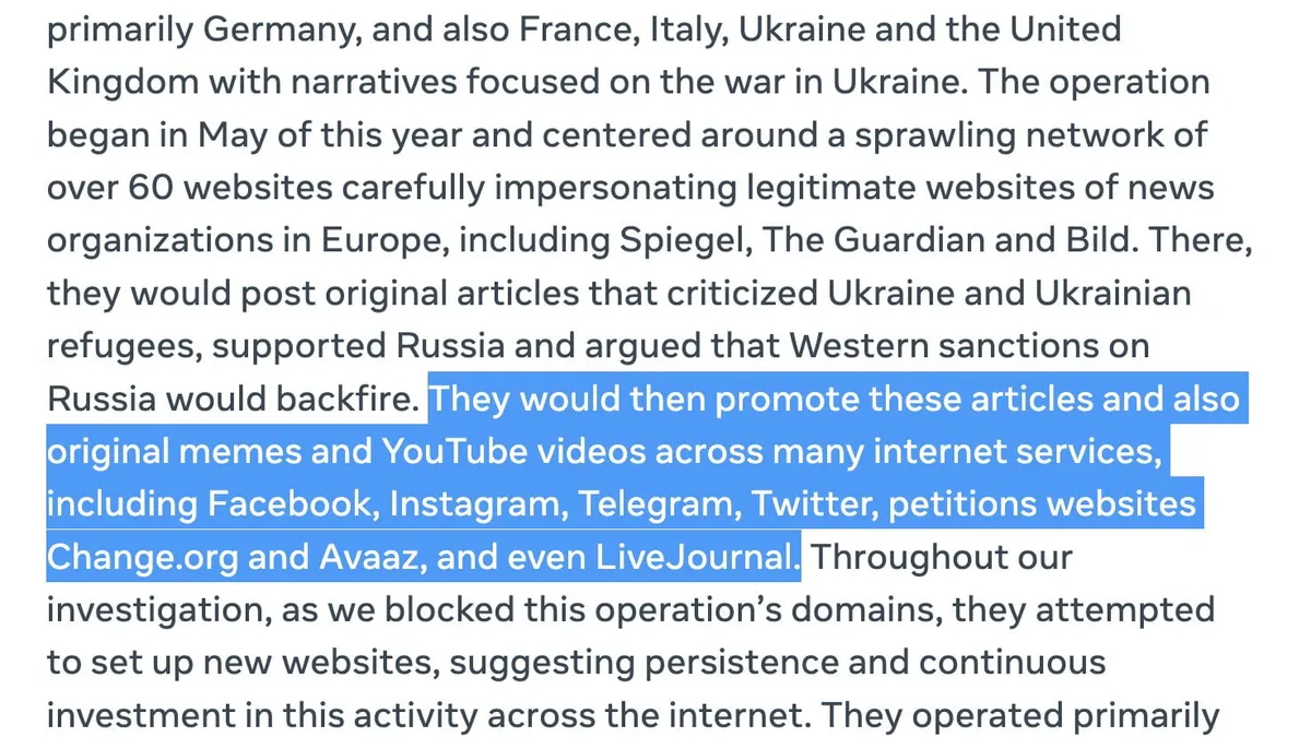Reţeaua rusă posta acolo articole care criticau Ucraina şi pe refugiaţii ucraineni sau susţineau Rusia, după care le distribuia pe YouTube, Facebook, Instagram, Telegram, Twitter sau site-uri de petiţii online.